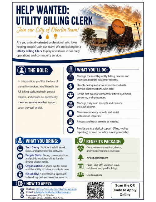 Are you a detail-oriented professional who loves helping people? Join the City of Oberlin team! We are looking for a Utility Billing Clerk to play a vital role in our daily operations and community service.